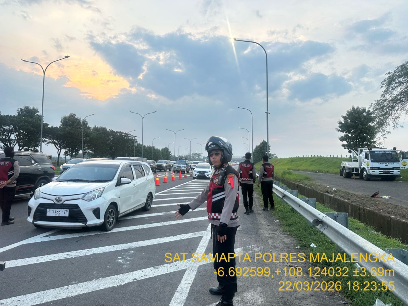Majalengka || Corongkita.com – Menjamin kelancaran arus balik dan mobilitas masyarakat pada H+1 Hari Raya Idulfitri 1447 H, jajaran Polres Majalengka melalui Operasi Ketupat Lodaya 2026 memperketat pengamanan di jalur bebas hambatan. Pada Minggu sore (22/3/2026), personel Sat Samapta Polres Majalengka melaksanakan pengaturan lalu lintas intensif di KM 152 Tol Cipali, yang merupakan titik krusial pertemuan arus kendaraan.