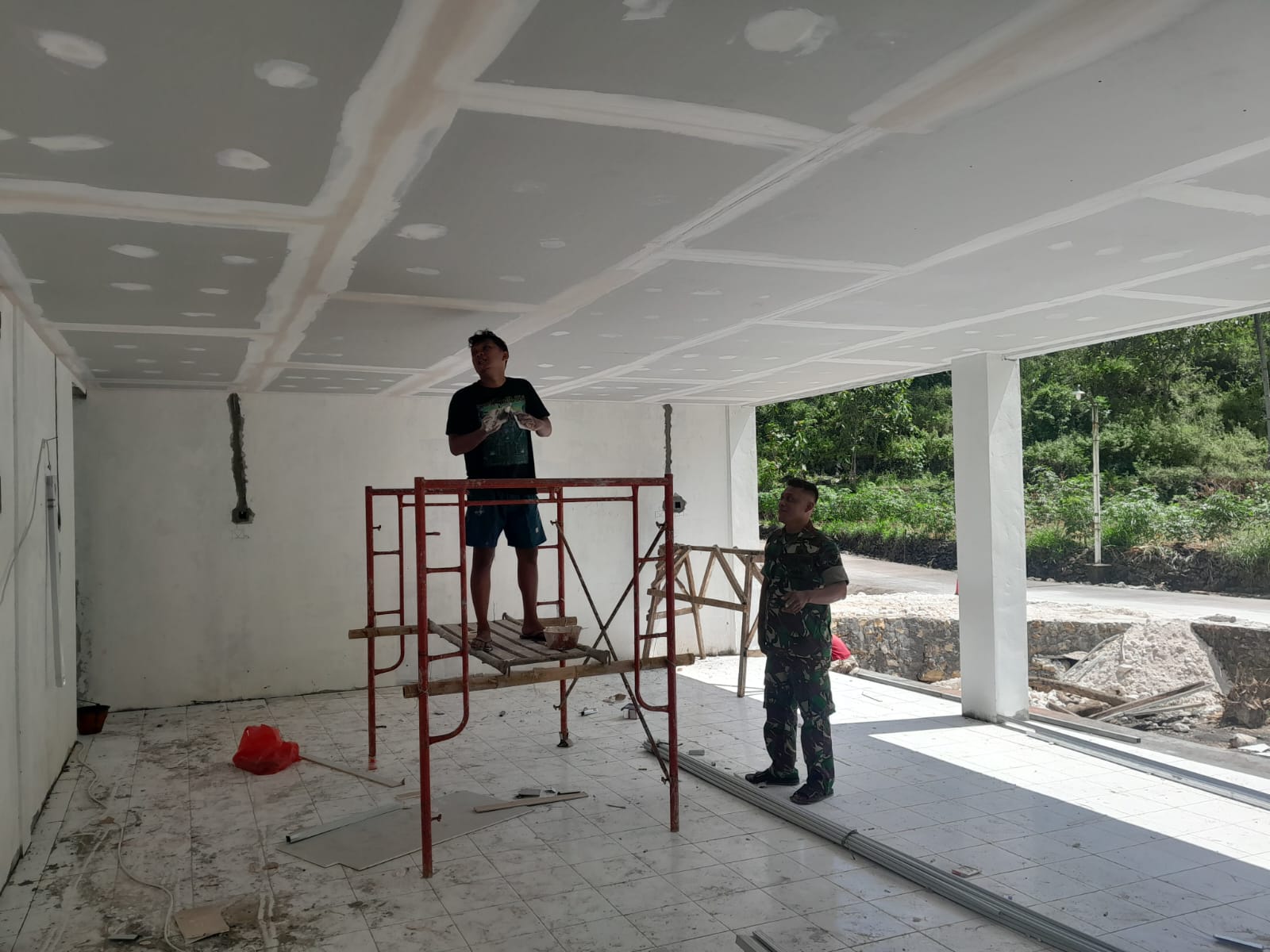 Kini, fokus utama pembangunan adalah penyelesaian saluran pembuangan kamar mandi di bagian luar gedung serta finishing plafon di ruang dalam. Pekerja terlihat sigap menggali saluran, memasang pipa, hingga merapikan plafon gypsum yang sudah mulai terpasang rapi.