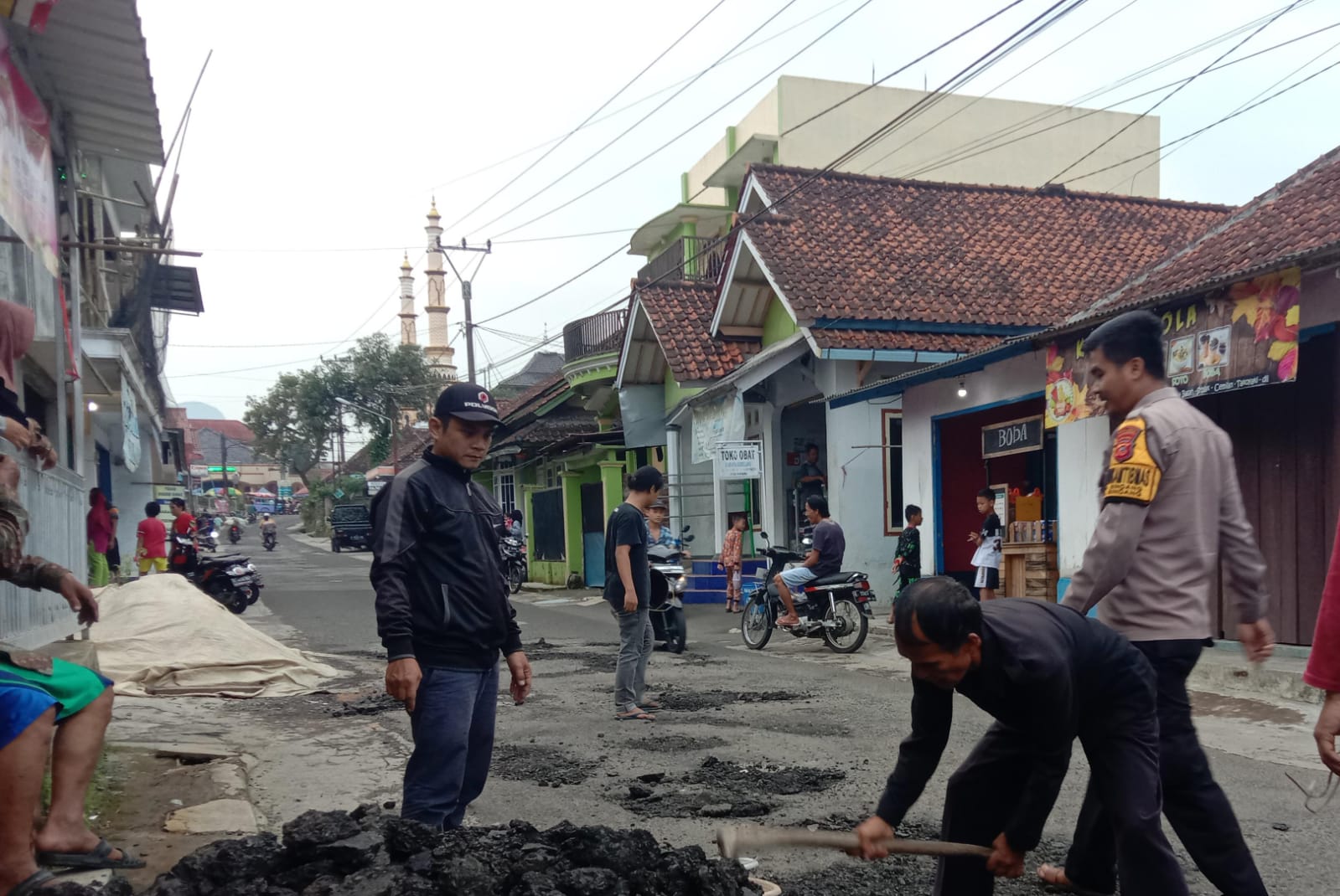 Bripka Mochamad Ali Akbar terlibat langsung dalam proses perbaikan jalan rusak tersebut. Dengan semangat gotong-royong, bersama warga masyarakat, lubang-lubang di jalan yang rawan menyebabkan ketidaknyamanan bagi pengguna jalan segera ditambal.