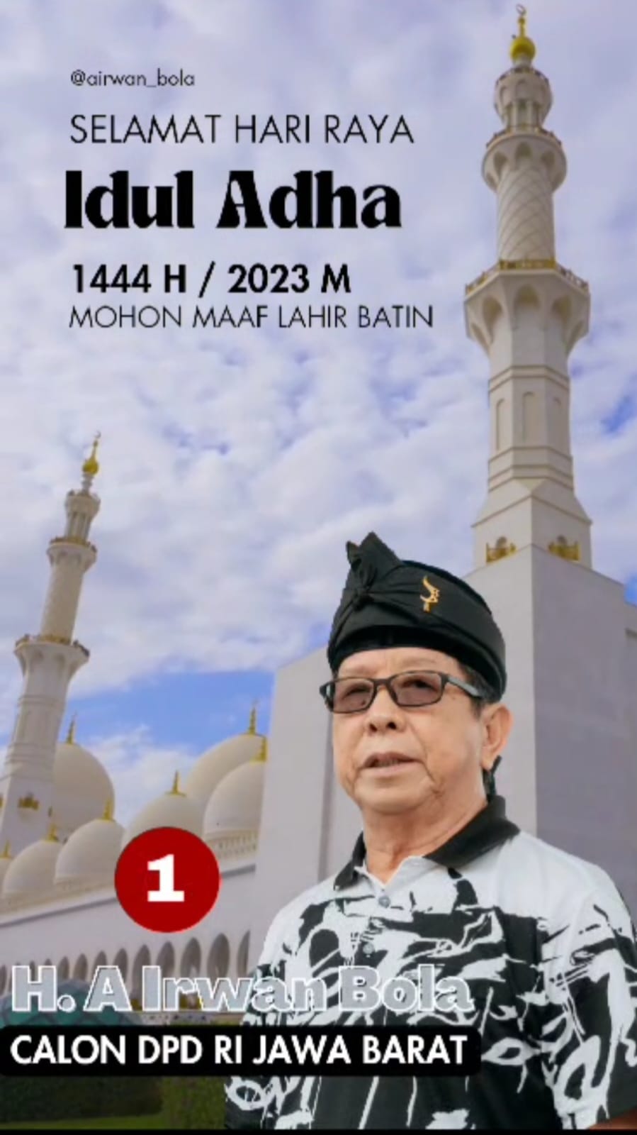 Dalam suasana Hari Raya yang penuh berkah ini, saat ditemui awak media di kediamannya, Calon DPD RI Jawa Barat dengan nomor urut 1, H. A Irwan Bola mengucapkan Selamat Hari Raya Idul Adha 1444 H / 2023 M Mohon Maaf Lahir dan Batin. Kamis (29/06/2023)