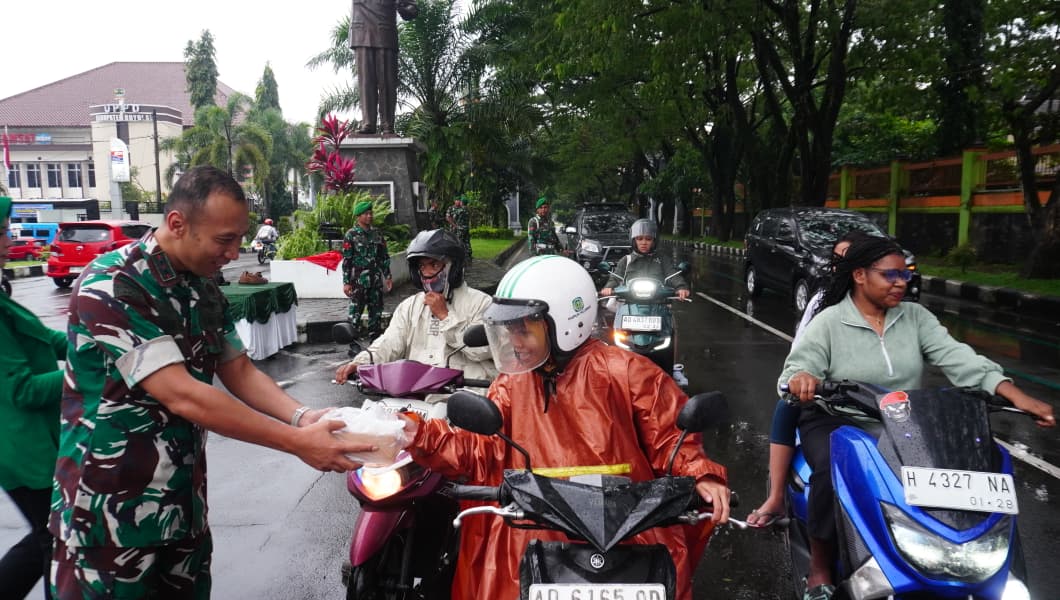 Ratusan paket menu berbuka puasa dibagikan kepada para pengendara roda dua, sopir angkutan umum maupun pribadi, serta pejalan kaki yang melintas menjelang waktu berbuka. Dengan penuh keramahan, prajurit TNI dan anggota Persit menyapa masyarakat sembari menyerahkan paket makanan dan minuman ringan dan kolak sebagai pelengkap berbuka puasa.