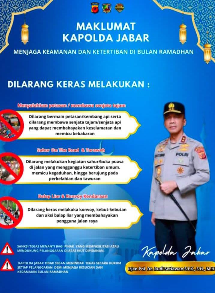 Kapolda Jawa Barat Irjen Pol. Dr. Rudi Setiawan menyampaikan bahwa maklumat ini dikeluarkan sebagai bentuk komitmen kepolisian dalam memberikan rasa aman kepada masyarakat yang menjalankan ibadah di bulan suci.