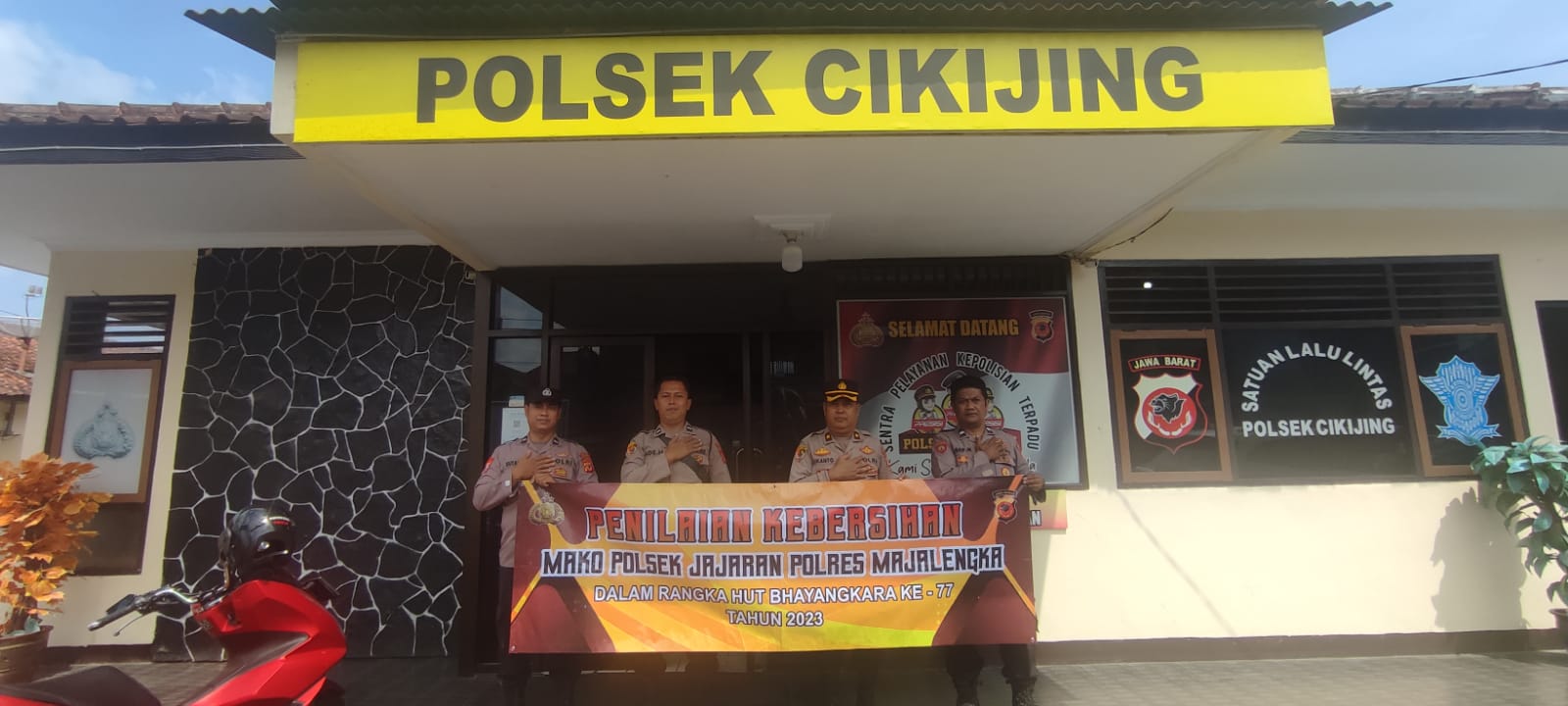 Jelang HUT Bhayangkara Ke-77, Tim Penilai Kebersihan Mako Dari Polres Majalengka Melakukan Evaluasi Menyeluruh Di Mako Polsek Cikijing.