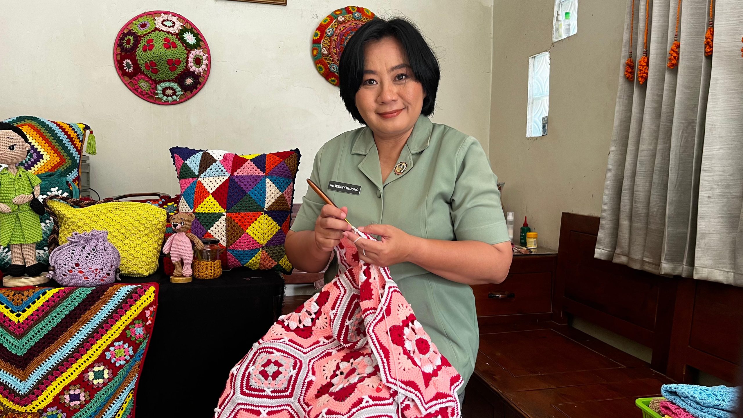 “Karya terakhir saya adalah payung rajut yang khusus di desain untuk ibu KASAD, yang beliau gunakan pada saat Upacara HUT Kemerdekaan RI ke-80 bersaam karya-karya UMKM ibu-ibu Persit lainnya.”ucapnya bangga.