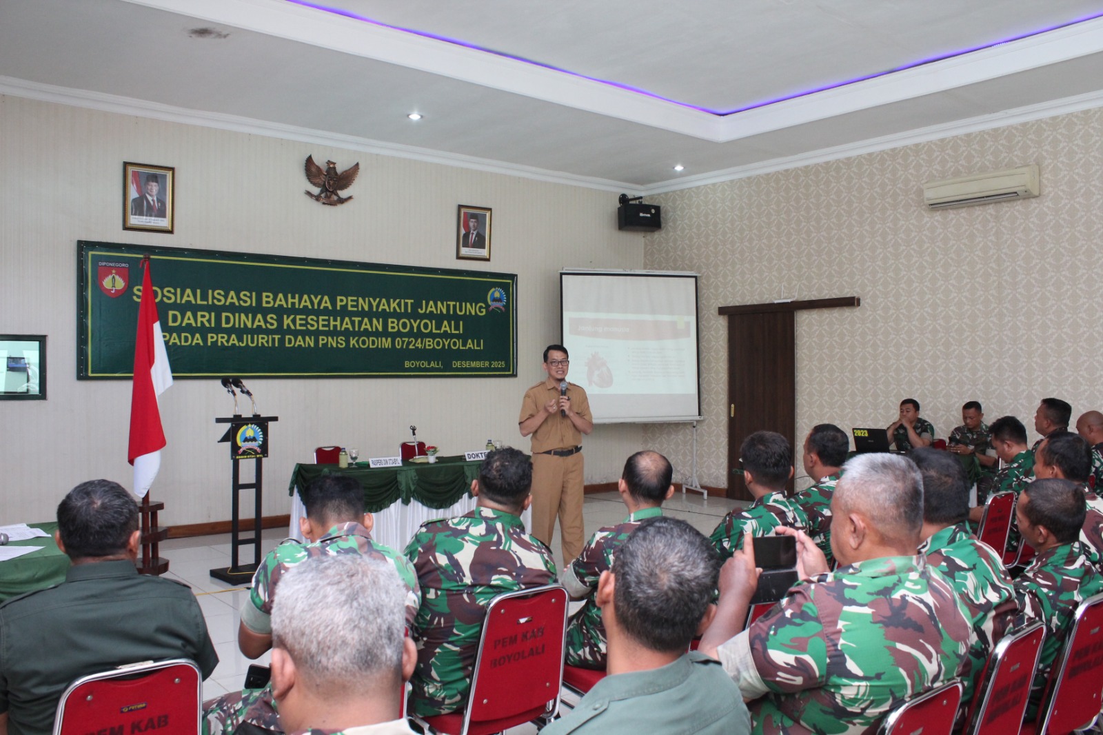 Boyolali || Corongkita.com – Dalam upaya meningkatkan kesadaran akan pentingnya kesehatan serta pencegahan penyakit tidak menular, khususnya penyakit jantung, Kodim 0724/Boyolali bekerja sama dengan Dinas Kesehatan Kabupaten Boyolali menggelar sosialisasi dan penyuluhan kesehatan tentang bahaya penyakit jantung. Kegiatan ini berlangsung di Aula Makodim 0724/Boyolali, Jalan Padanaran, Desa Tegalmulyo, Kecamatan Mojosongo, Kabupaten Boyolali, Senin (22/12/2025).