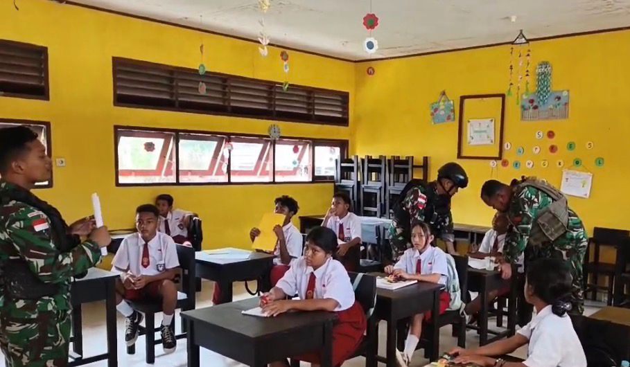 DISTRIK VASCODAMNEM, TELUK BINTUNI || Corongkita.com – Untuk menanamkan semangat belajar dan karakter disiplin, Satgas Yonif 410/Alugoro mengajarkan Beberapa materi tentang kenegaraan kepada para siswa/siswi di SD Inpress Stengkol 3 di Distrik Vascodamnem Kab. Teluk Bintuni, Papua Barat. Senin, (20/4/2026).