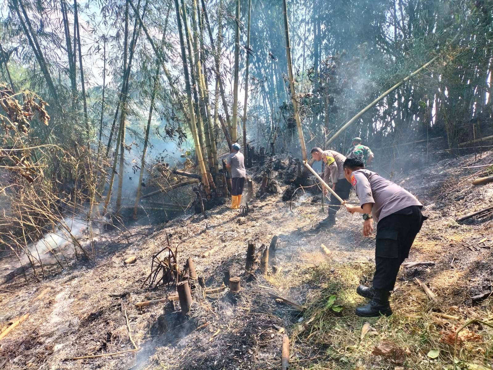 Ps. Panit Samapta l Aipda Eman Subagja bersama Bhabinkamtibmas Bripka Kurdiyanto, Babinsa dan warga sekitar bekerja sama untuk mengendalikan dan memadamkan api yang telah mengancam lingkungan dan keselamatan warga dengan menggunakan alat manual yang ada di sekitar area kebakaran dan air yg di ambil menggunakan R4 Dinas ranger di rumah warga sekitar lalu di siram menggunakan ember seadanya.