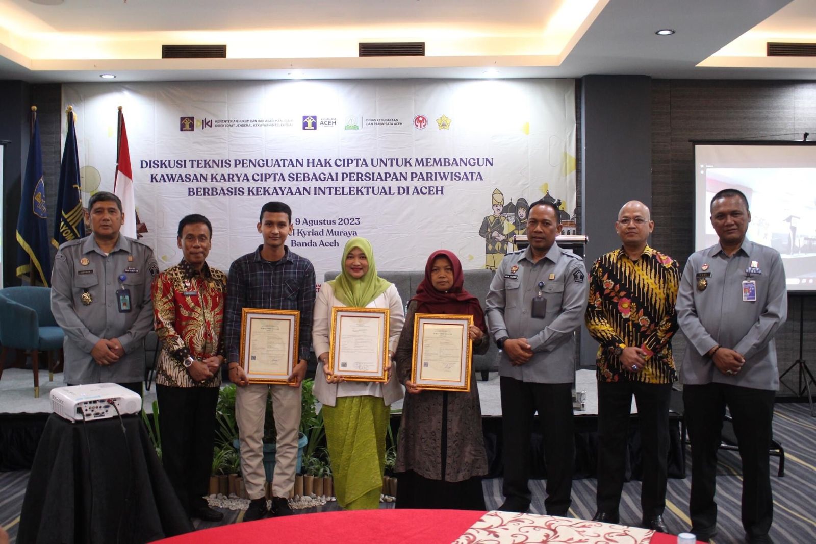 Banda Aceh || Corongkita.com – Plh. Kepala Kantor Wilayah Kementerian Hukum dan Hak Asasi Manusia Aceh, Lilik Sujandi membuka Diskusi Teknis Penguatan Hak Cipta untuk Membangun Kawasan Karya Cipta Sebagai Persiapan Pariwisata Berbasis Kekayaan Intelektual di Aceh yang diselenggarakan oleh Direktorat Jenderal Kekayaan Intelektual (DJKI) di Hotel Kyriad Muraya pada Rabu (9/8/2023).