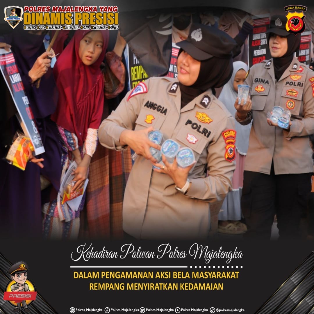Para Polwan Polres Majalengka tidak hanya bertugas mengamankan aksi, namun mereka juga peduli terhadap peserta aksi dan anak-anak yang dibawa orang tuanya ikut dalam aksi tersebut. Mereka membagikan air mineral kepada peserta aksi maupun anak-anak yang turut hadir dalam aksi bersama orang tua mereka.