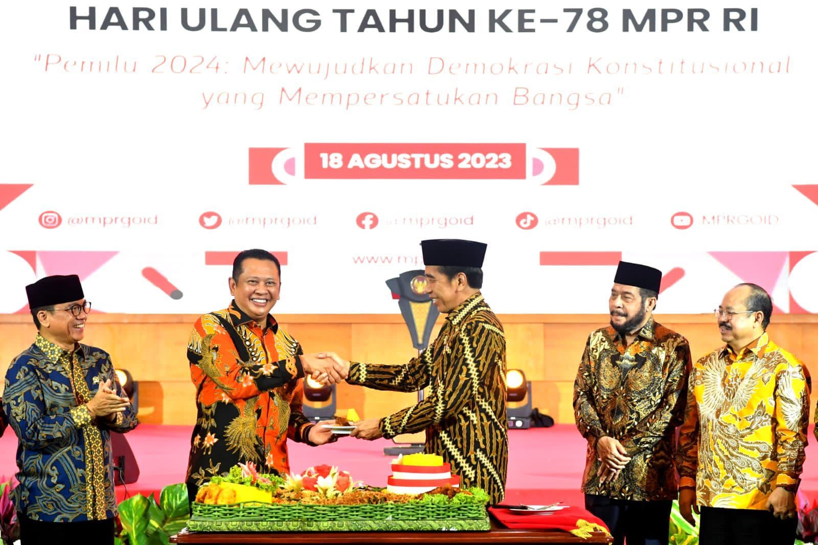 Demikian disampaikan oleh Presiden Jokowi saat menghadiri peringatan Hari Konstitusi sekaligus Hari Ulang Tahun Ke-78 Majelis Pemusyawaratan Rakyat Republik Indonesia (MPR RI) yang digelar di Gedung MPR RI, pada Jumat, 18 Agustus 2023.