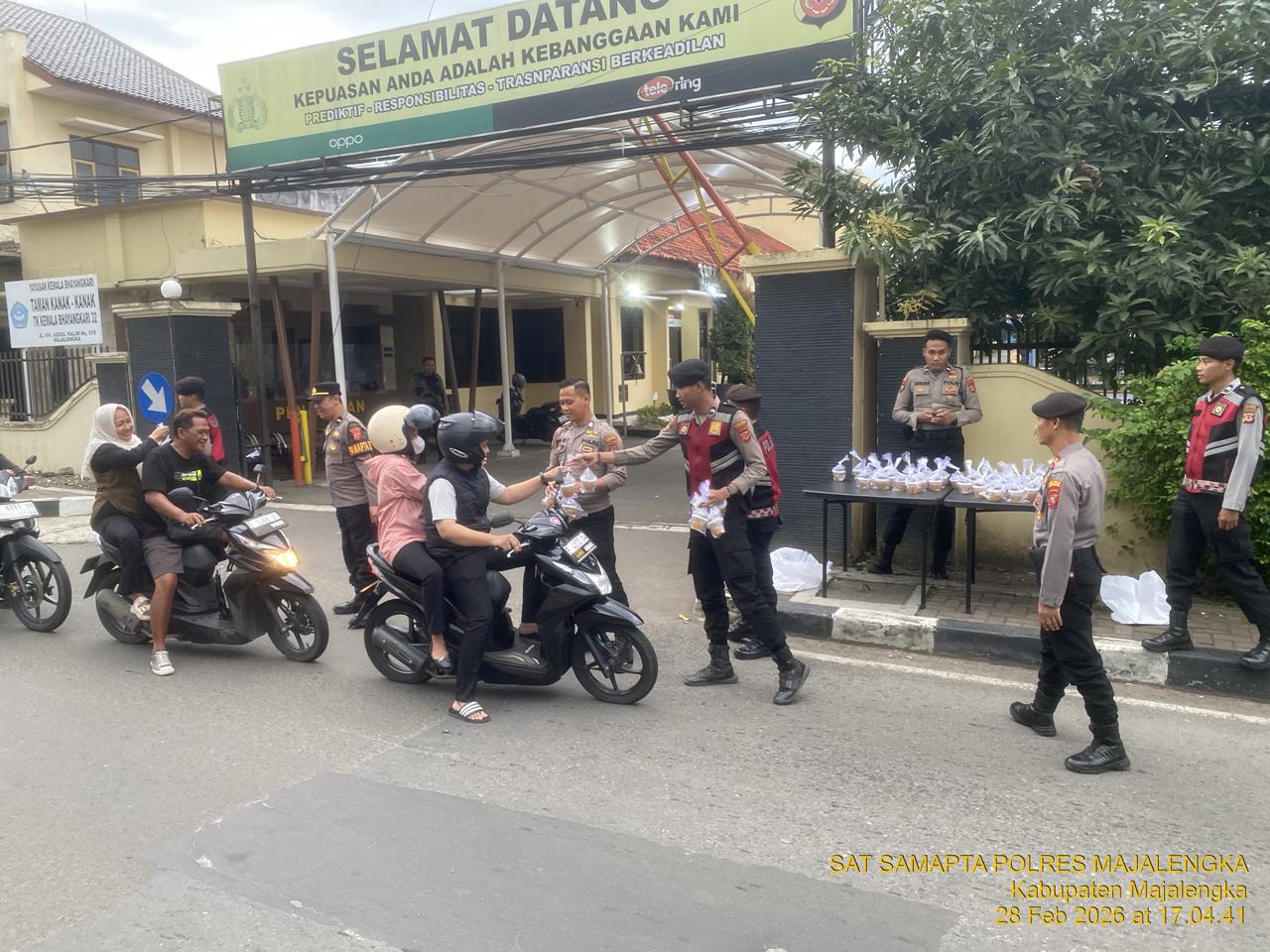 Kegiatan tersebut dilaksanakan di depan Mako Polres Majalengka dan menyasar para pengendara serta masyarakat yang melintas menjelang waktu berbuka puasa. Personel Sat Samapta tampak membagikan paket takjil secara langsung dengan penuh semangat dan sikap humanis.