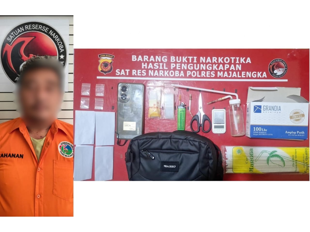 Selain itu, polisi juga mengamankan berbagai perlengkapan yang diduga digunakan untuk aktivitas peredaran maupun konsumsi narkotika, seperti plastik klip bening, timbangan digital, pipet kaca modifikasi, alat hisap sabu (bong), korek api gas modifikasi, gunting, sedotan, serta amplop kosong. Petugas juga menemukan satu unit telepon genggam merek Oppo A58 yang disimpan di dalam kotak sabun di kamar mandi.