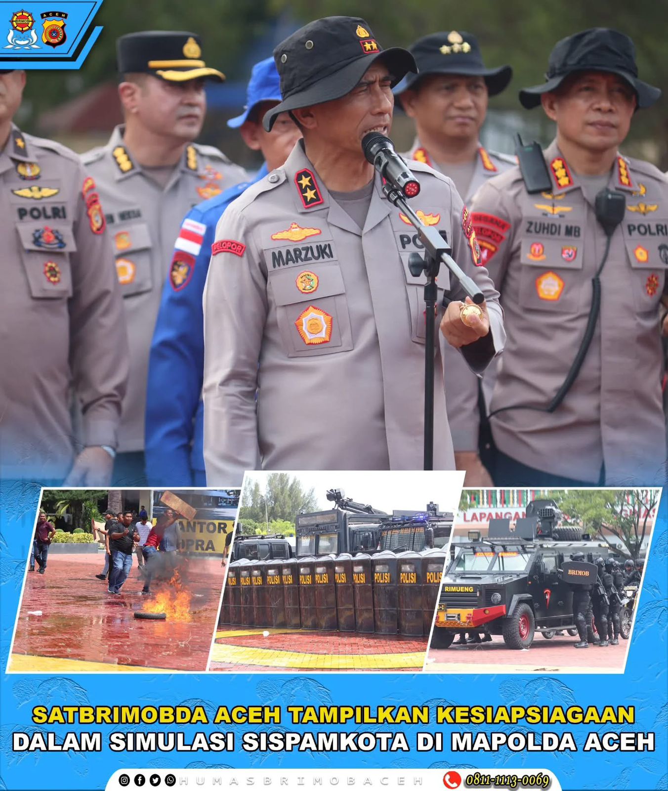 Banda Aceh || Corongkita.com – Kamis, 30 April 2026, personel Satuan Brimob Polda Aceh melaksanakan kegiatan simulasi Sistem Pengamanan Kota (Sispamkota) di Mapolda Aceh yang dipimpin langsung oleh Kapolda Aceh, Irjen Pol. Marzuki Ali Basyah, M.M.