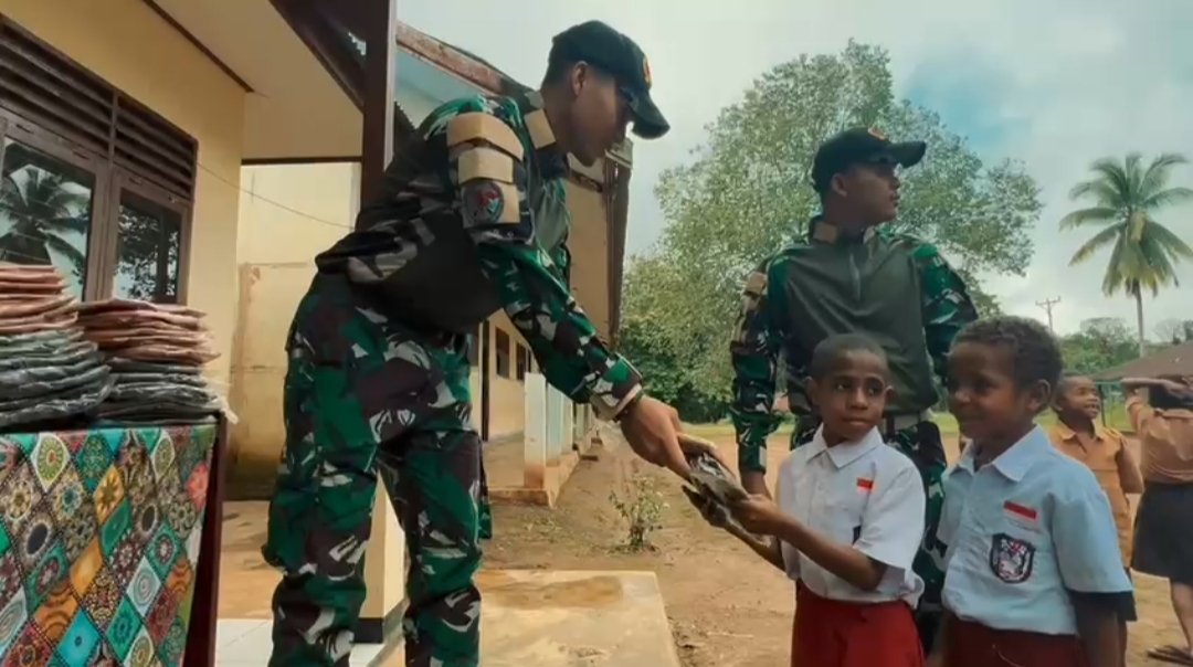 Melalui Pos Bade, para prajurit melaksanakan kegiatan sosial berupa pembagian seragam Pramuka kepada siswa SD Negeri Bade Mememu, Distrik Edera, Kabupaten Mappi, Provinsi Papua Selatan.