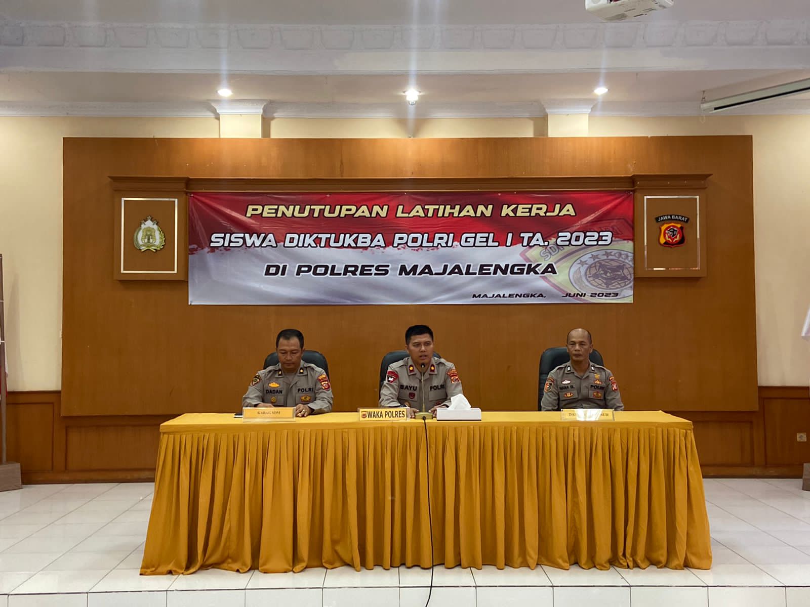 Dalam kesempatan itu, Wakapolres Majalengka Kompol Bayu Purdantono, S.I.K., M.I.K. menyampaikan ucapan terima kasih kepada pendamping yang telah membantu pelaksanaan Latihan Kerja (Latja) siswa Diktukba Polri SPN Polda Jabar di Polres Majalengka tanpa ada pelanggaran.