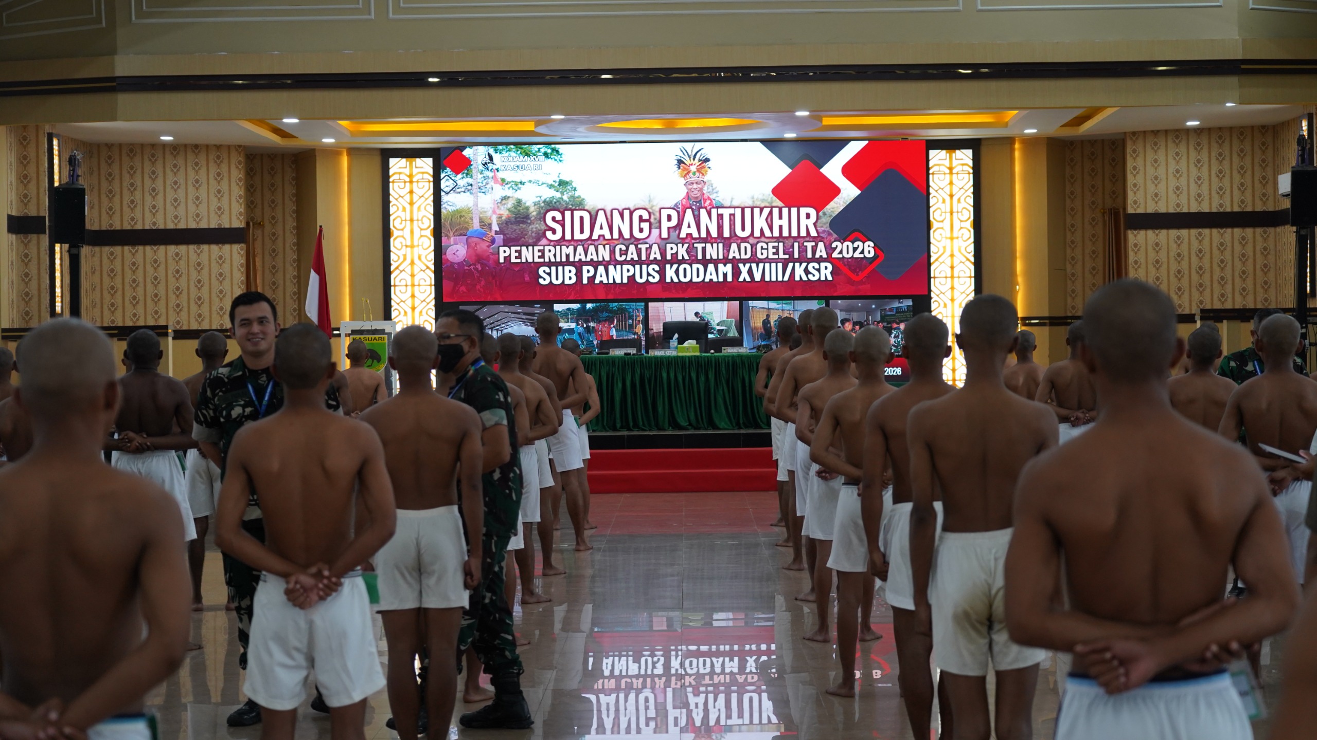 Manokwari || Corongkita.com – Kodam XVIII/Kasuari menggelar Sidang Pantukhir Calon Tamtama Prajurit Karier (Cata PK) TNI AD Gelombang I Tahun Anggaran 2026, di Aula Makodam XVIII/Kasuari, Jumat (13/03/2026). Kegiatan tersebut dipimpin oleh Kolonel Inf Hendra S., selaku Wakil Ketua Sub Panitia Pusat (Sub Panpus) Kodam XVIII/Kasuari, yang diikuti oleh 358 calon prajurit.
