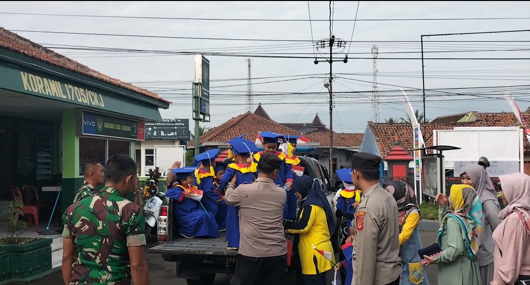 Majalengka || Corongkita.com – Kekompakan TNI-Polri kembali terlihat saat Personil Polsek Cikijing Polres Majalengka Polda Jabar, Ps. Panit Samapta l Aipda Eman Subagja, Bhabinkamtibmas Aiptu Usin dan Anggota Koramil Cikijing Sertu Yayat melaksanakan pengawalan pawai wisuda TK Al-Mufti Desa Sukamukti Kecamatan Cikijing Kabupaten Majalengka. Minggu (18/06/2023).