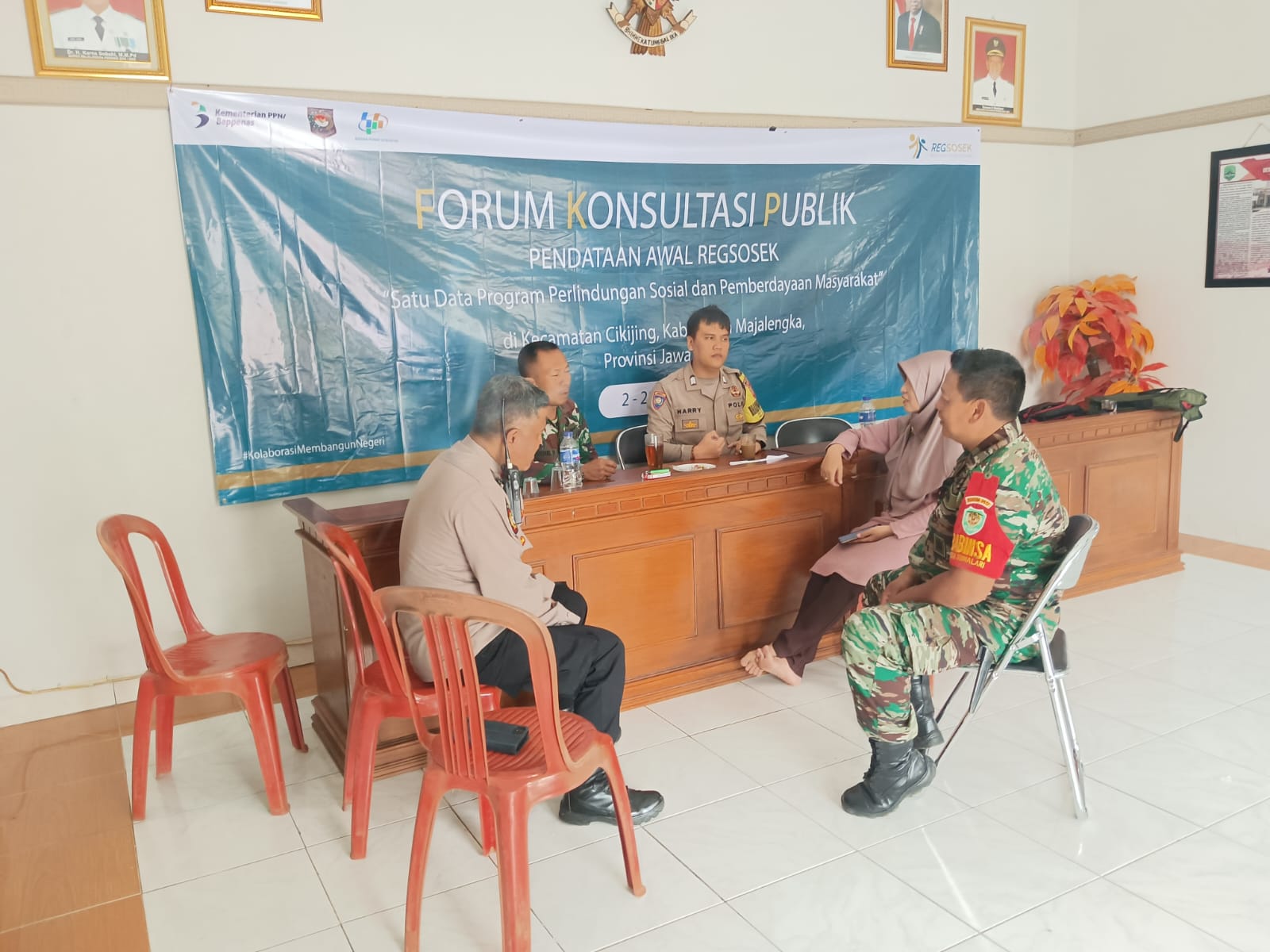 Majalengka || Corongkita.com – Kapolsek Cikijing Polres Majalengka Polda Jabar, Kompol Romdani, S.H beserta anggota dan Danramil Cikijing Kapten Inf. Dadang Purnomo beserta anggota melaksanakan monitoring pelaksanaan forum konsultasi publik (FKP) hasil pendataan awal registrasi sosial ekonomi (Regsosek) oleh Badan Pusat Statistik (BPS) Kabupaten Majalengka yang bertempat di Kantor Desa Sunalari Kecamatan Cikijing Kabupaten Majalengka. Minggu (07/05/2023).