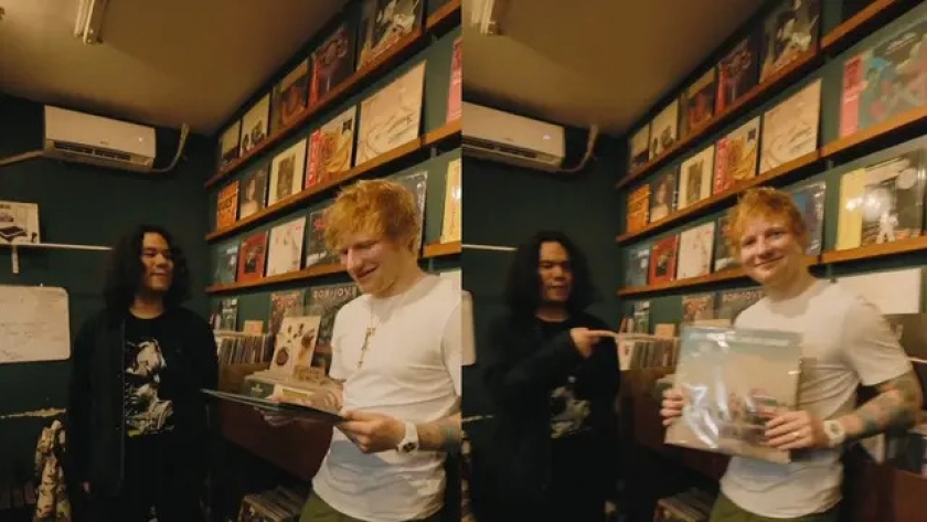 Setelah menanyakan harga, Ed Sheeran juga sempat berpose dengan album indie White Shoes & The Couples Company. Begitu sang penjaga toko menginformasikan bahwa album tersebut adalah first press alias cetakan pertama, ia makin girang.