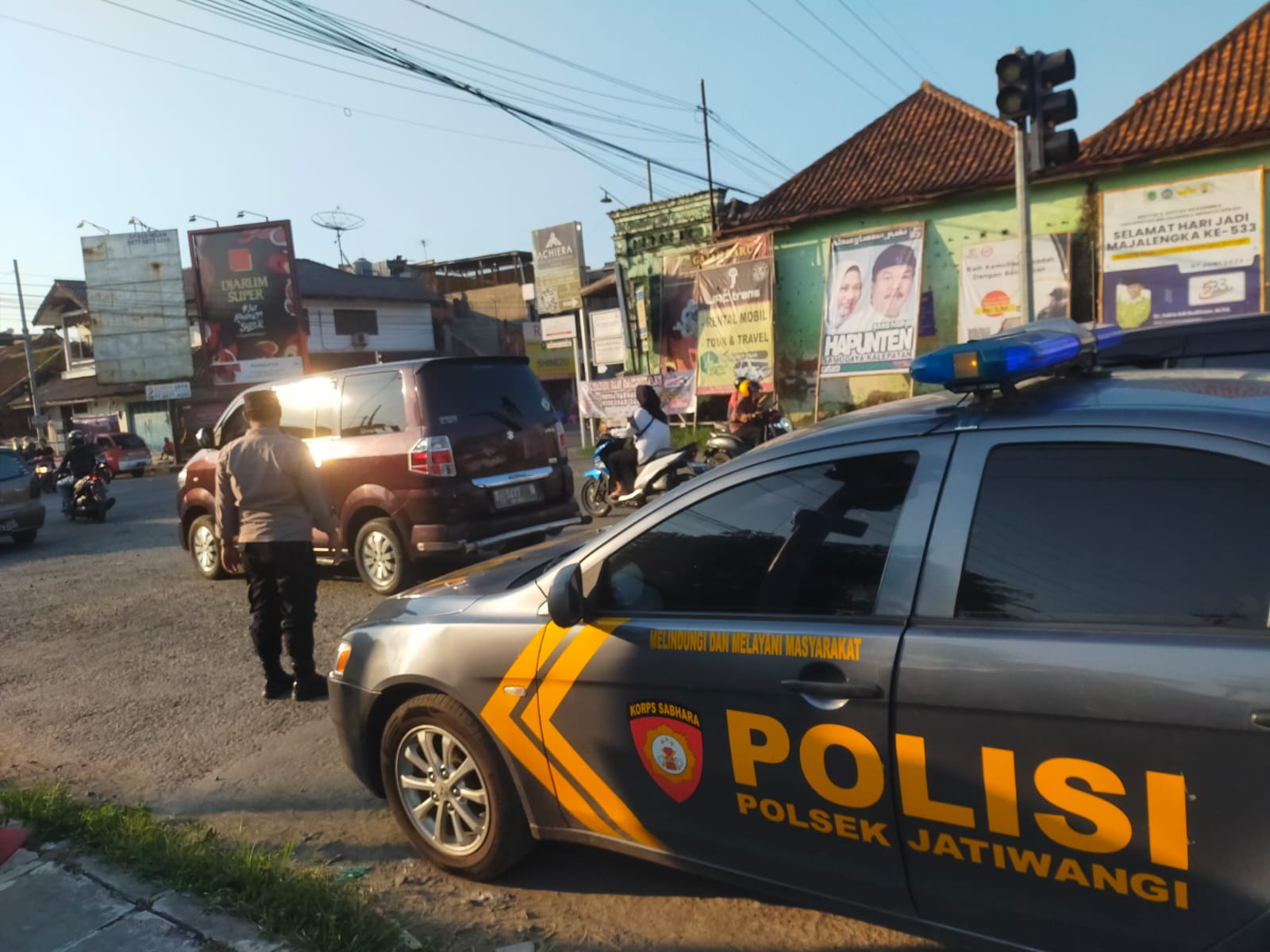 Sore hari merupakan jam rawan terjadinya Laka Lantas dan kemacetan, sehingga jajaran Polsek Jatiwangi Polres Majalengka melakukan pengamanan dan pengaturan arus lalu lintas dalam upaya antisipasi terjadinya kecelakaan lalu lintas dan kemacetan di Wilayah Hukum Polsek Jatiwangi Polres Majalengka.
