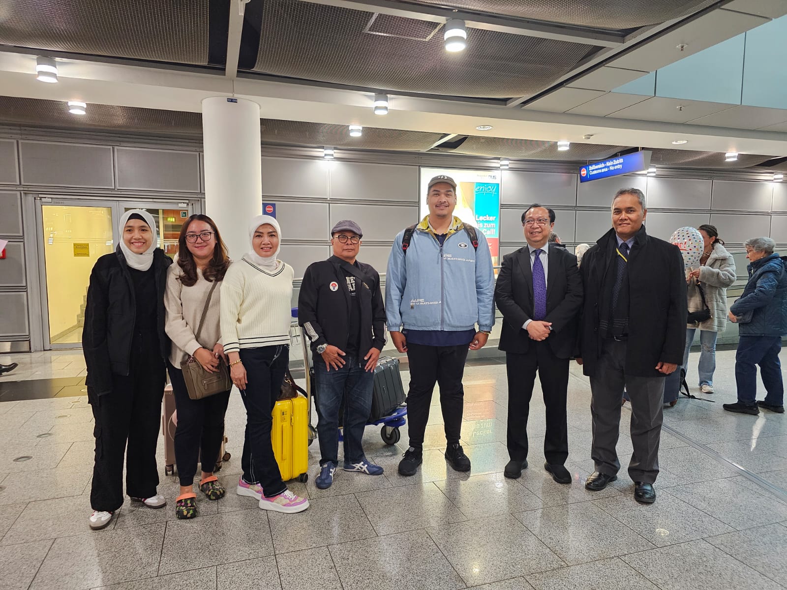 Rombongan Menpora disambut oleh Kepala Konsulat Jenderal Republik Indonesia Frankfurt, Antonius Yudi Triantoro dan Pengurus Komite Olahraga Masyarakat Indonesia (KORMI).