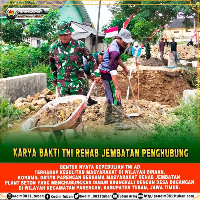 TUBAN || Corongkita.com – Bentuk nyata kepedulian TNI AD terhadap kesulitan masyarakat di wilayah binaan, Koramil 0811/18 Parengan bersama masyarakat rehab jembatan plant beton yang menghubungkan dusun Brangkali dengan desa Dagangan Kecamatan Parengan, Kabupaten Tuban, Jawa Timur. Kamis, (26/02/2026).